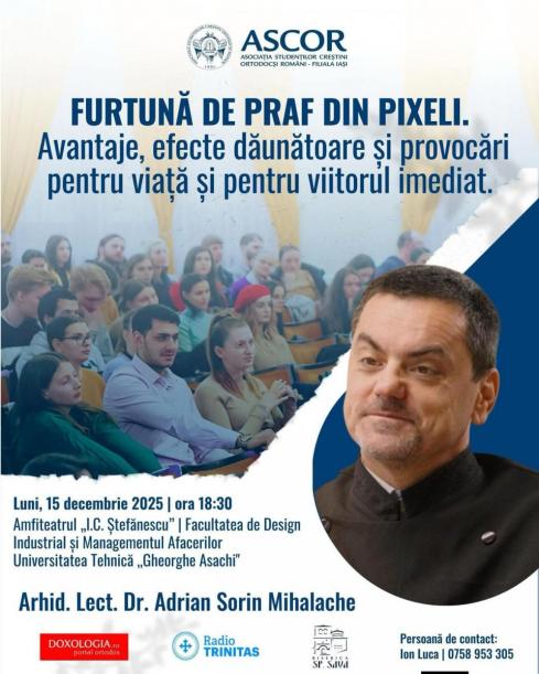 Asociația Studenților Creștini Ortodocși Români – Filiala Iași, în colaborare cu Biserica „Sfântul Sava” din Iași, organizează astăzi, începând cu ora 18.30, ultima conferință din seria dedicată Postului Nașterii Domnului. Evenimentul se va desfășura în Amfiteatrul „I.C. Ștefănescu” de la Facultatea de Design Industrial și Managementul Afacerilor, Universitatea Tehnică „Gheorghe Asachi” Iași, situată în apropiere de Iulius Mall.