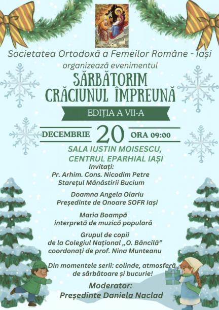 Societatea Ortodoxă a Femeilor Române organizează, începând cu ora 9.00, la Sala Iustin Moisescu a Centrului Eparhial Iași, evenimentul „Sărbătorim Crăciunul Împreună”, ediția a VII-a, având ca invitați pe părintele arhimandrit Nicodim Petre, Consilierul Sectorului de Misiune, Statistică și Prognoză Pastorală al Arhiepiscopiei Iașilor și starețul Mănăstirii Bucium din Iași, pe doamna Angela Olariu, Președinte de Onoare al SOFR Iași, alături de grupuri de colindători.